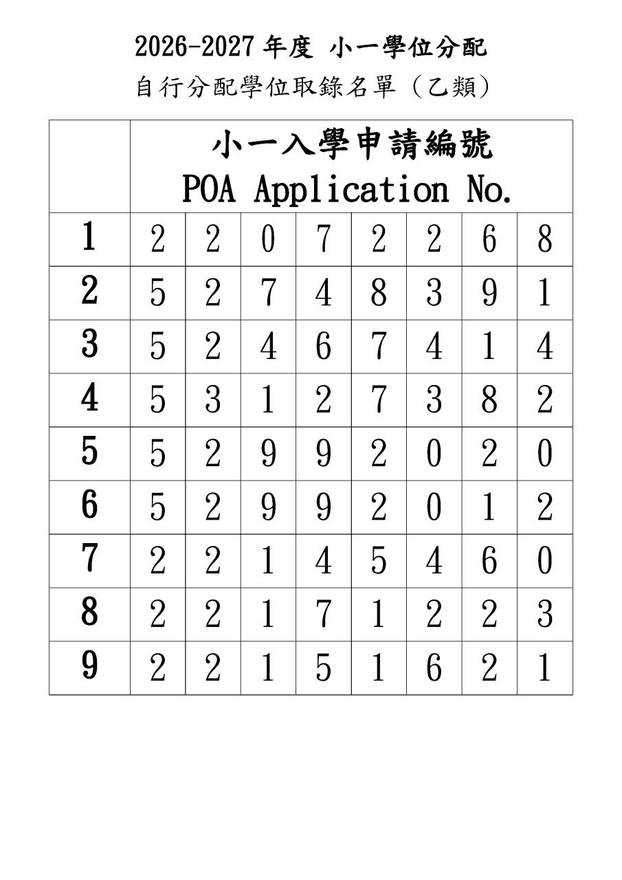 2026-2027年度小一自行分配學位取錄名單